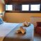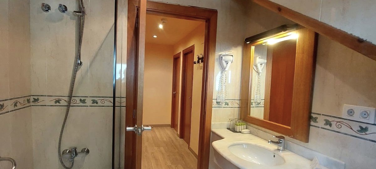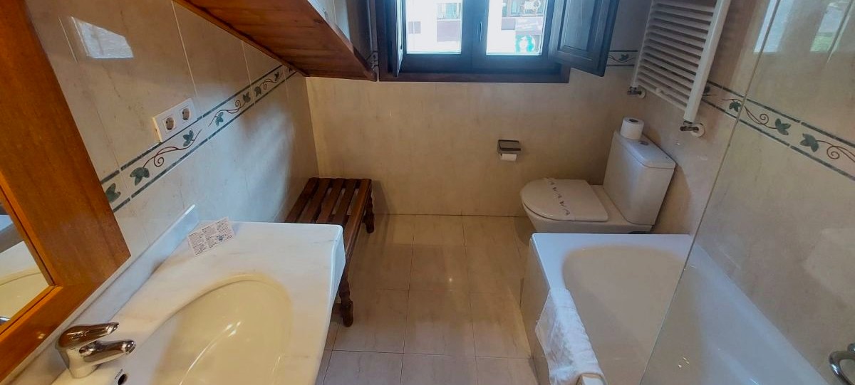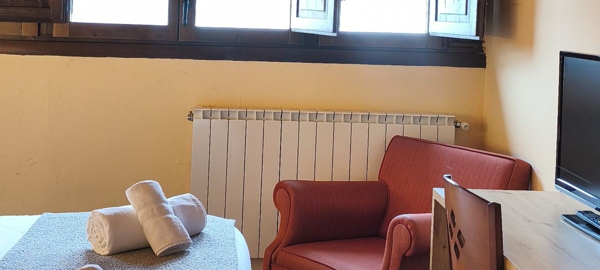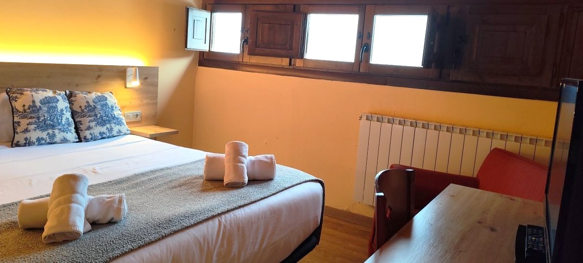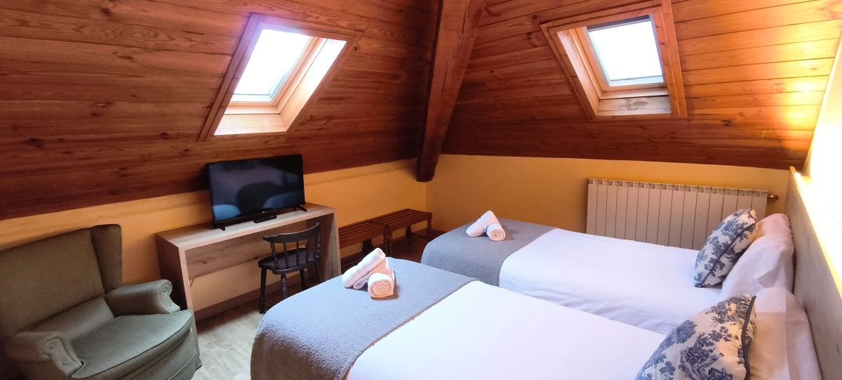 Family room with two independent attic bedrooms in a space of 50m2. One of the bedrooms has two single beds and another bedroom a double bed. Both bedrooms are communicated and with a view of the mountains.